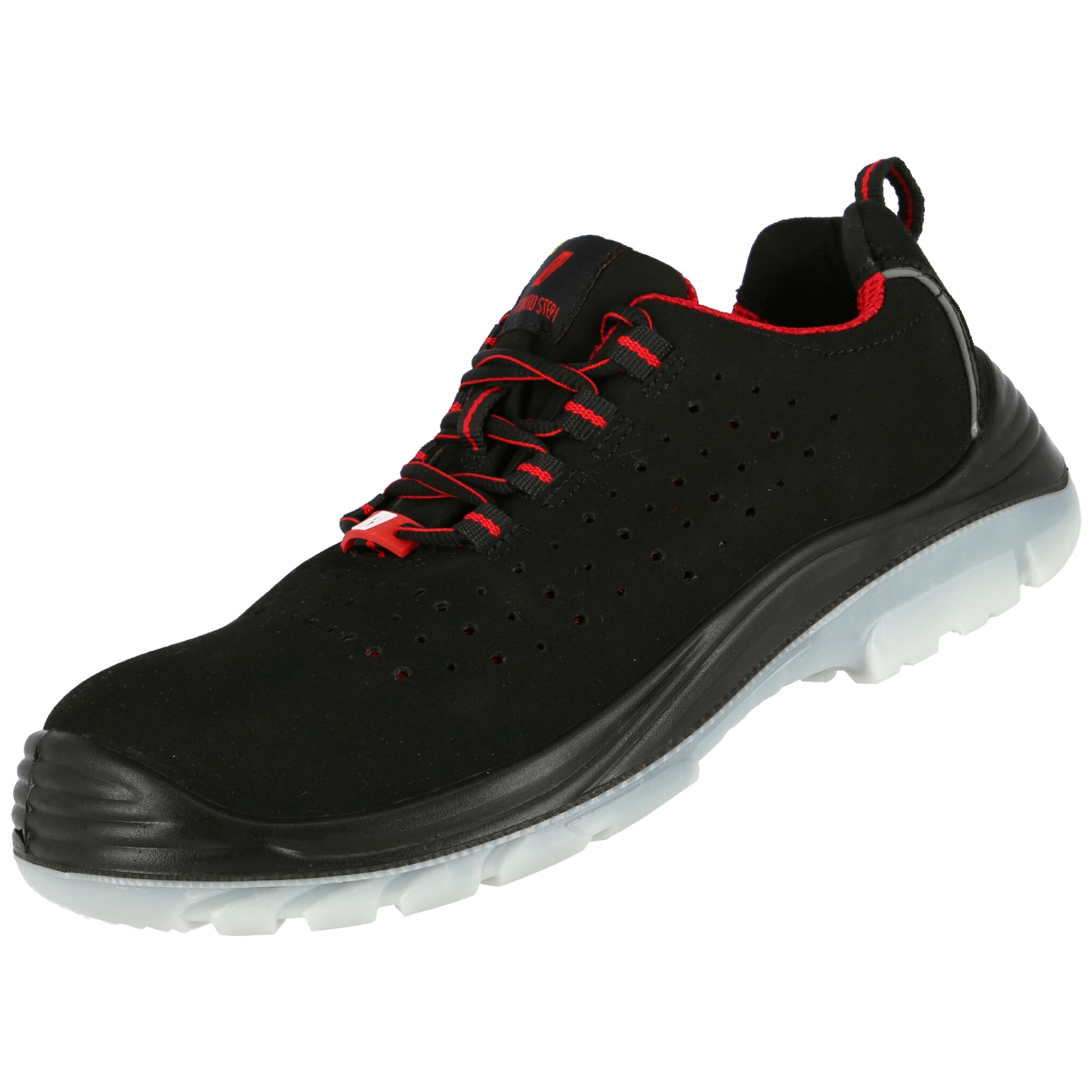 NITRAS MICRO STEP, półbuty bezpieczne, S1 P, trwała mikrofibra, czarna (kod koloru: 1000), trwała podeszwa zewnętrzna z PU/TPU, czarna/przezroczysta, podnosek z włókna szklanego, tekstylna podeszwa środkowa odporna na przebicie, niezawierająca metalu, wysokiej jakości wkładka COMFORT STEP, ergonomicznie ukształtowana, atrakcyjny design, najlepsza możliwa antypoślizgowość (SRC), szerokość 11, odblaskowe paski na pięcie, wyściółka pięty ułatwiająca zakładanie i zdejmowanie oraz wykonane wzmocnienia pięty z wytrzymałej mikrofibry, testowany zgodnie z zasadą DGUV 112-191, typ 1, typ 2, odporny na ESD, kategoria ryzyka ŚOI II